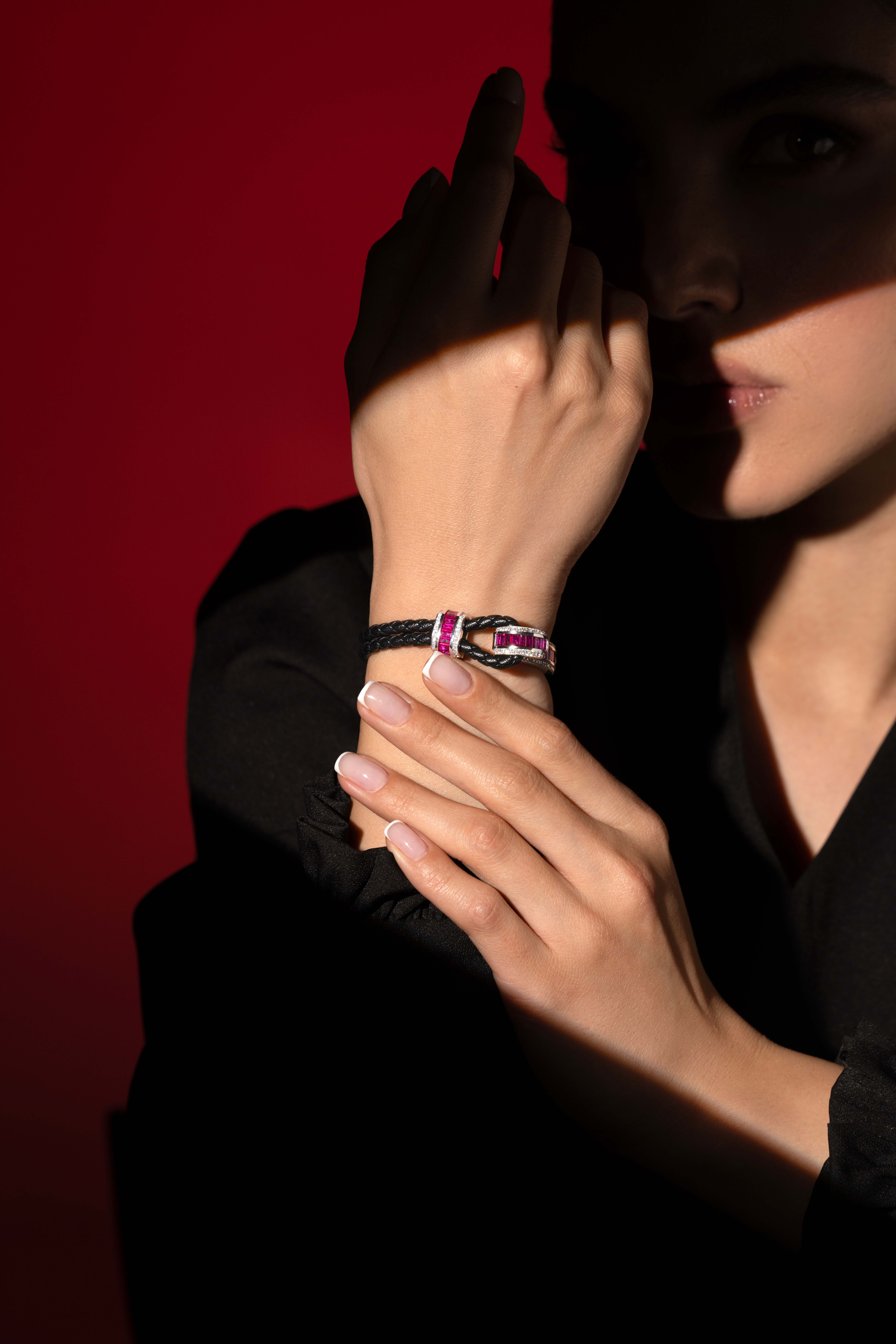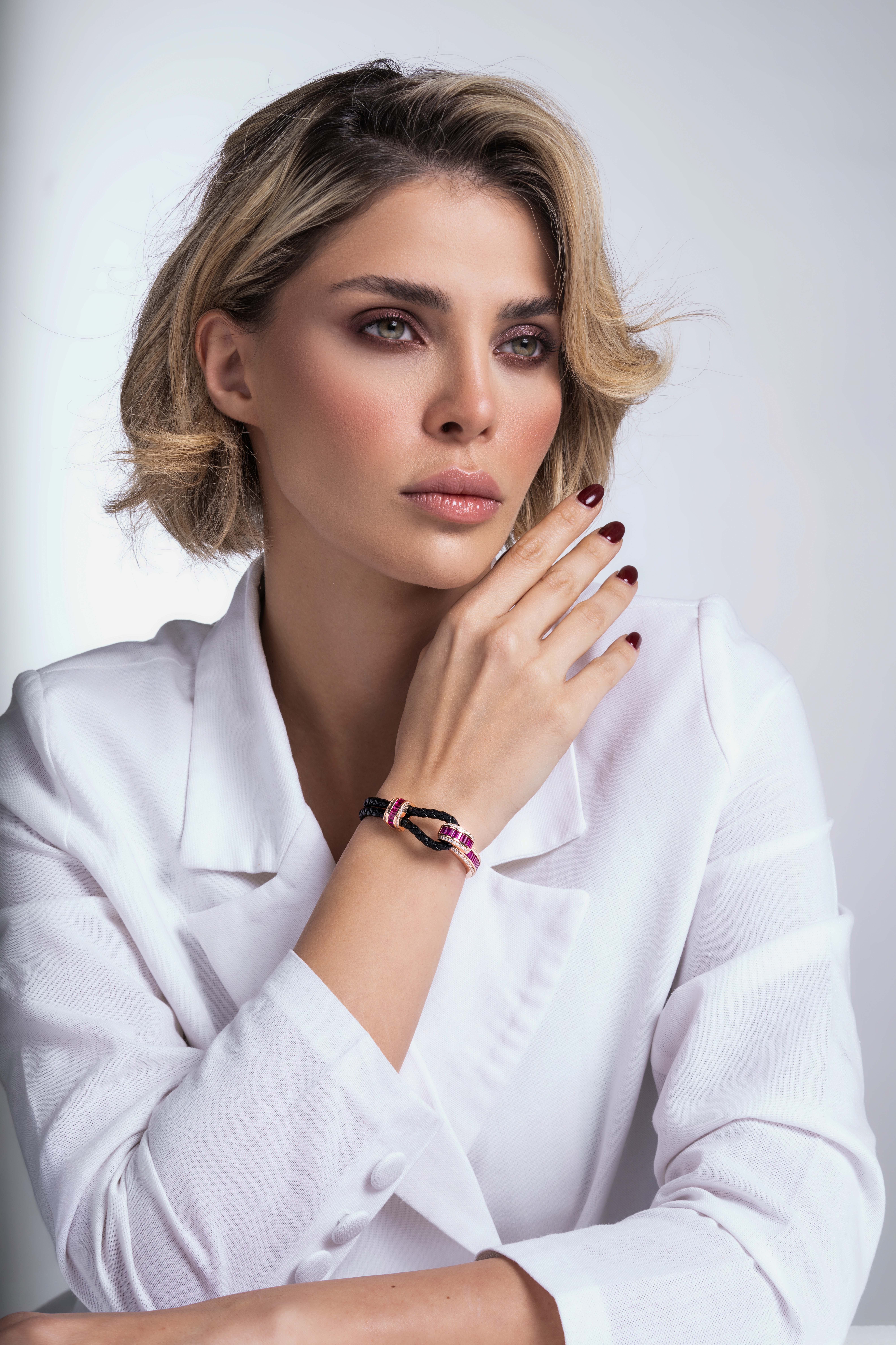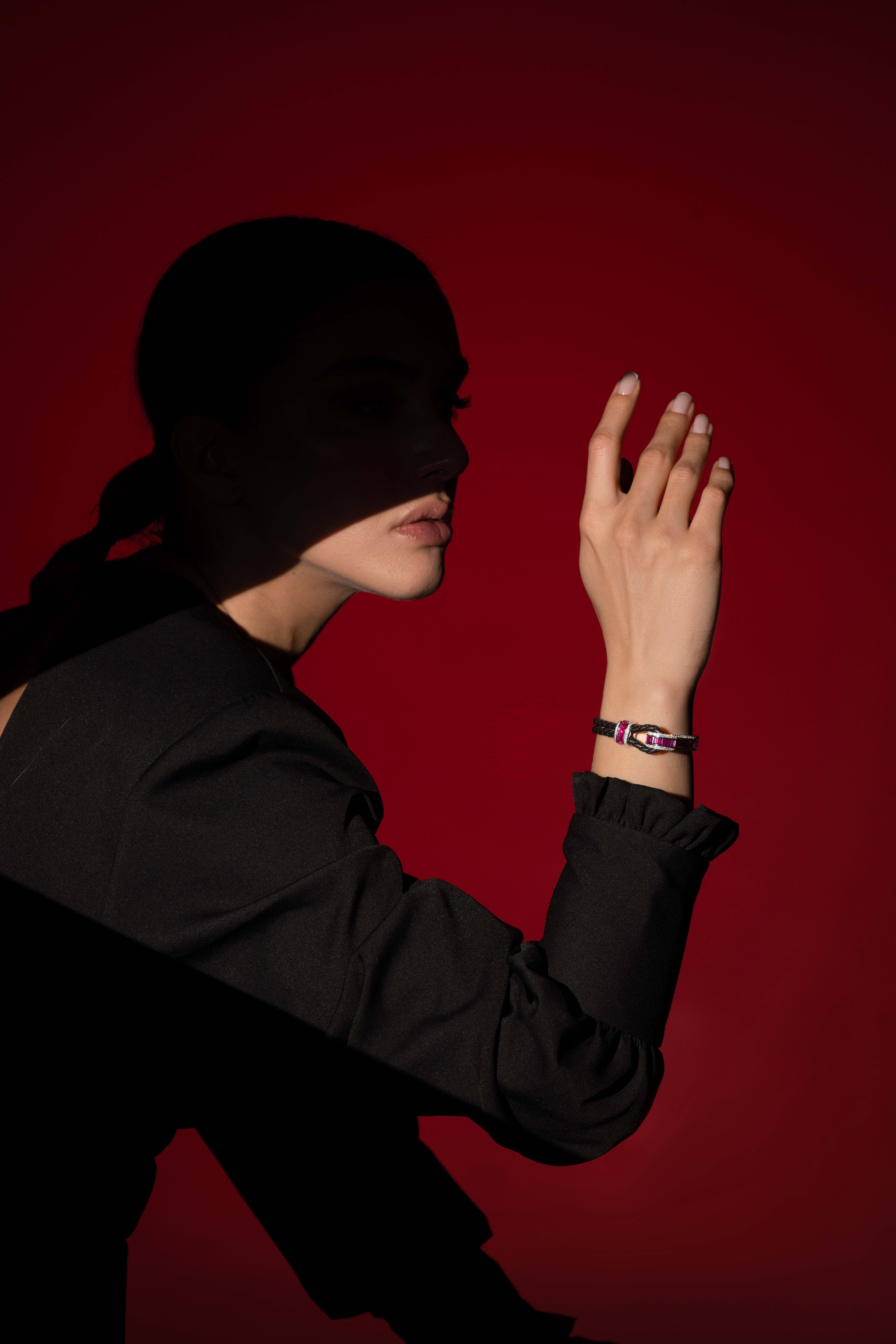 شایلین رز نوئیر | Shayleen rose Noirترکیب جسورانه چرم مشکی و سنگهای صورتی سواروسکی، شایلین رز نوار را به نمادی از ظرافت مدرن تبدیل کرده است. درخشش سنگهای باگت که با دقت مخراجکاری شدهاند، در کنار بند چرمی مشکی با قابلیت شخصیسازی، استایلی خاص و متفاوت برای شما میسازد. این مدل همچنین با امکان سفارش جواهرات اصل، انتخابی منحصربهفرد برای سلیقههای خاص است.