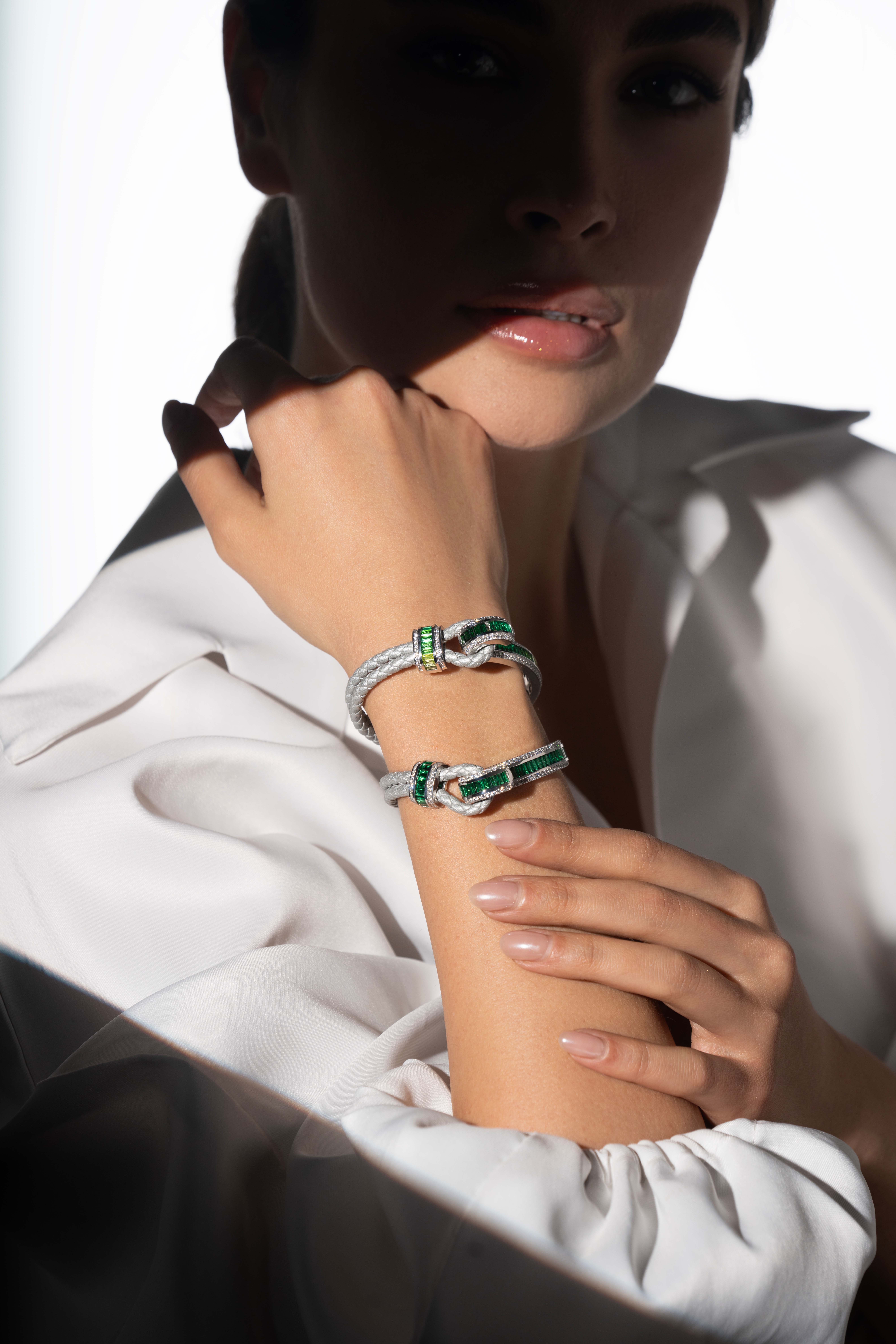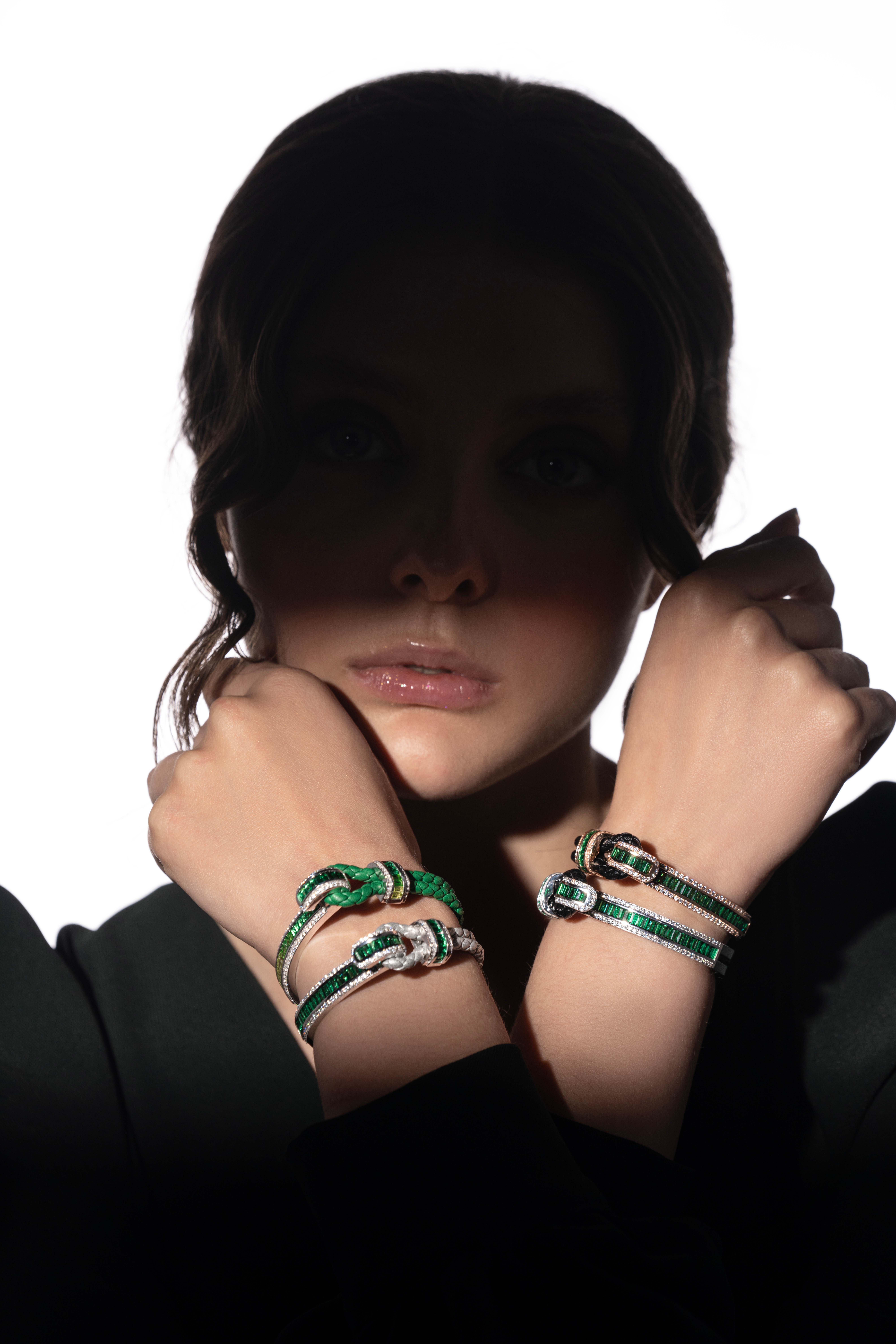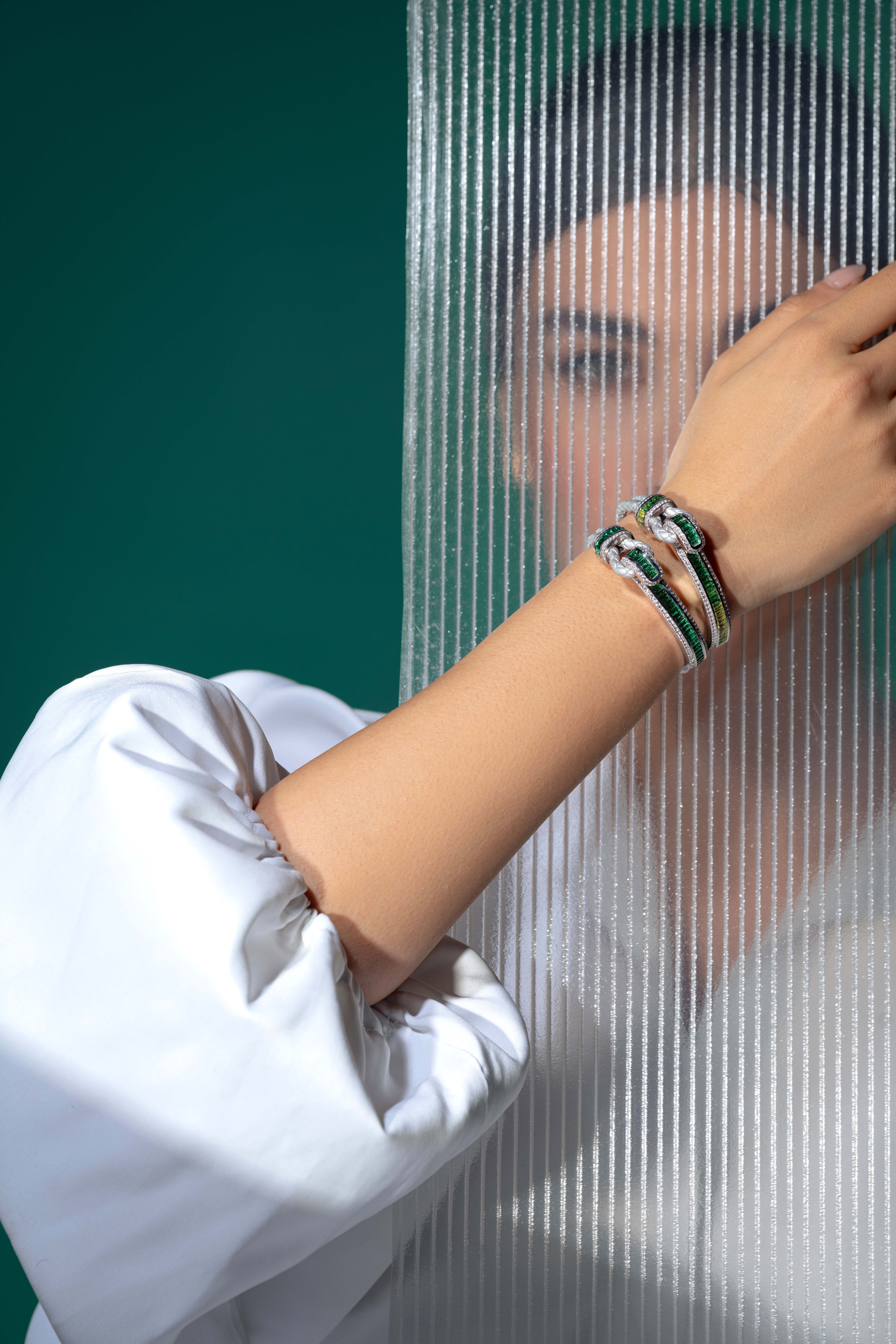 شایلین اِمِرالد گلو/Shayleen Emerald Glowاین دستبند از طلای سفید خودرنگ ساخته شده؛ یعنی رنگ و درخشندگی خاصش از ترکیب آلیاژ طلا به دست آمده و همیشگی است، بدون نیاز به آبکاری. نگینهای سبز سواروسکی با دقت و هنرمندی به روش مخراجی و کاملاً دستی روی این قطعه نشستهاند— جایی که کیفیت، ظرافت و استحکام، همه در کنار هم قرار گرفتهاند. Emerald Glow با ترکیب رنگ سفید و سبز، نمادی از هارمونی طبیعت و مدرنیته نسخه سنگ Cadette با طراحی خاص خود گرادینت رنگی خیرهکنندهای ایجاد میکند؛ از روشنی شفاف تا تیرگی ژرف. این افکت رنگی تدریجی، حس حرکت نور در دل سنگ را القا میکند و دستبند را به یک اثر هنری مجسمهوار تبدیل میکند.