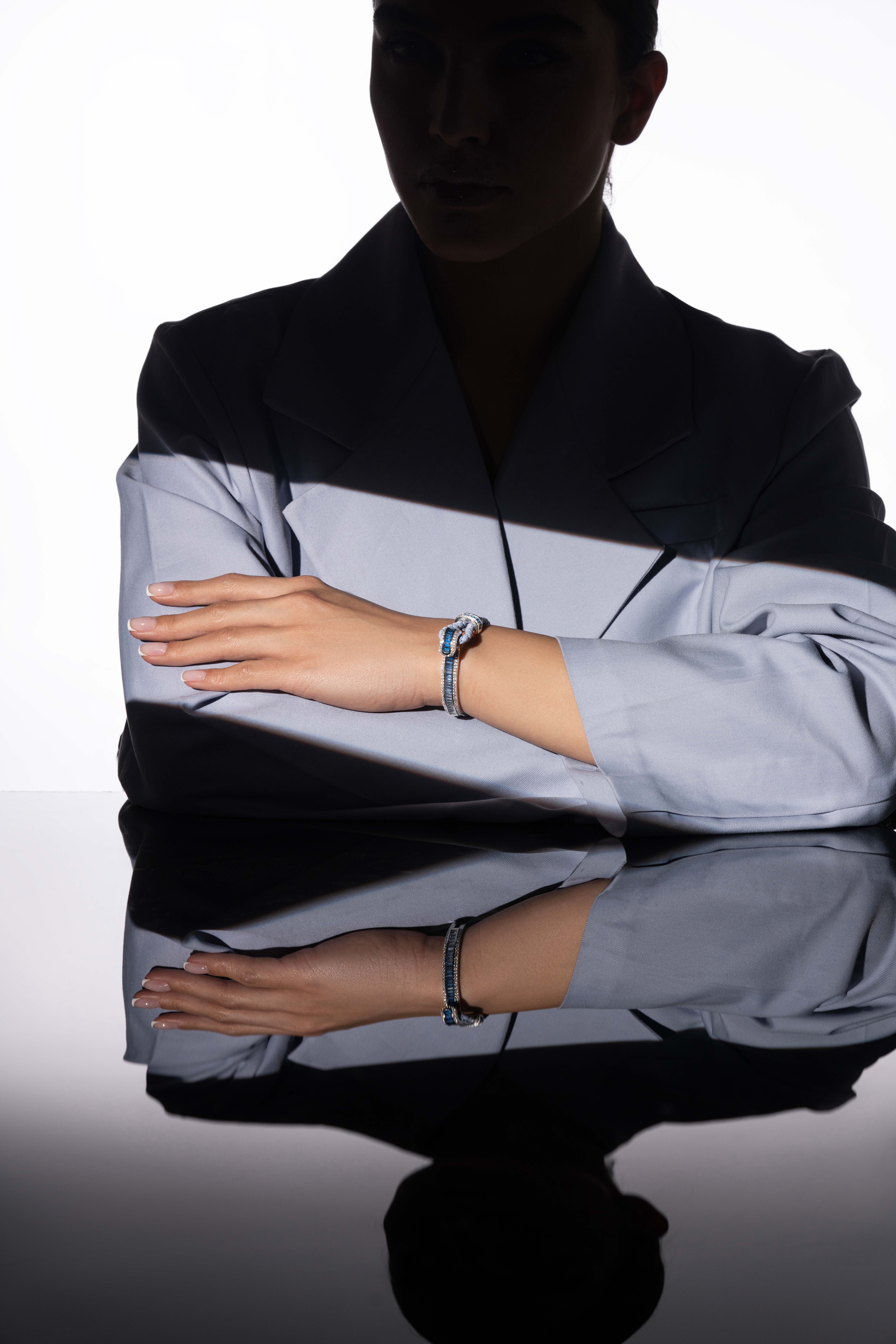 شایلین بلو کَسکِید کادِت/Shayleen Blue Cascade Cadetteدستبند Blue Cascade Cadette از کالکشن شایلین، تعریف جدیدی از ظرافت مدرن را با استفاده از طلای سفید خودرنگ و سنگهای Cadette آبی ارائه میدهد. در این مدل خاص، آلیاژ طلای سفید بدون هیچگونه آبکاری، احساس اصالت و ماندگاری را با جلوهای کاملاً طبیعی همراه ساخته است. در سطح دستبند، سنگهای Cadette با گرادیانی از آبی روشن تا آبی عمیق و تیره، با تکنیک مخراجی (pavé setting) کنار یکدیگر نشستهاند و افکت آبشارگونهای از رنگ و نور را پدید آوردهاند. این رنگآمیزی خاص، با هر حرکت دست، انعکاسهای دینامیک و چشمنوازی ایجاد میکند. Blue Cascade Cadette انتخابی ایدهآل برای کسانی است که به دنبال اکسسوریهای منحصربهفرد با ترکیب هنر، تکنیک روز و حس لوکس هستند؛ گزینهای متمایز برای کلکسیونرها و دوستداران جواهرات مدرن با رنگ آبی.