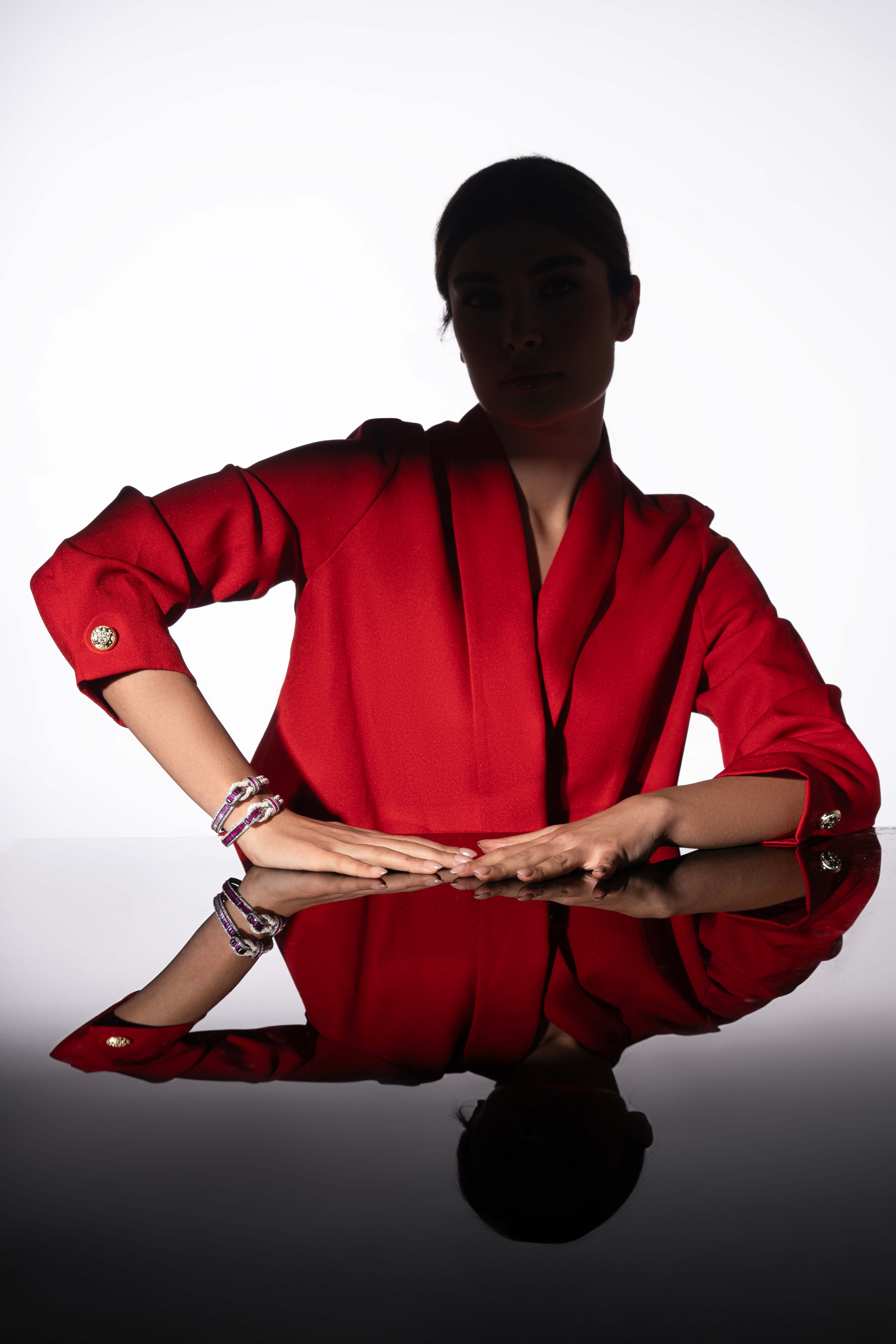 شایلین اَمِتیست رُیال/Shayleen Amethyst Royaleدستبندهای Amethyst Royale و Amethyst Royale Cadette از کالکشن شایلین، با ساختار زنجیری و حلقههای متصل، جلوهای نجیب و سلطنتی با الهام از طیف سنگ آمتیست و جواهرات سلطنتی دارند. در نسخه معمولی، ترکیب سنگهای سواروسکی بنفش شفاف، صورتی و طلایی روی طلای سفید خودرنگ و با تکنیک مخراجی (pavé setting) چیده شدهاند تا یک هماهنگی رنگی چشمنواز و درخشش خاص خلق کنند. نسخه Amethyst Royale Cadette با بهرهگیری از سنگهای Cadette با گرادیان طیف بنفش، صورتی تا طلایی، افکتی سیال و عمیق روی دستبند ایجاد میکند؛ این رنگآمیزی تدریجی، زیبایی متفاوتی به طراحی مدرن زنجیری بخشیده است. این مدل برای استایلهای خاص و لوکس، انتخابی ایدهآل است؛ چه برای استفاده روزمره با لباسهای رنگی، چه به عنوان نقطهی تأکید در مراسم و مهمانیها.
